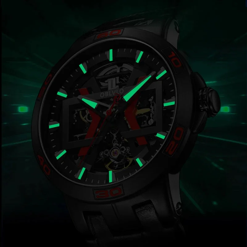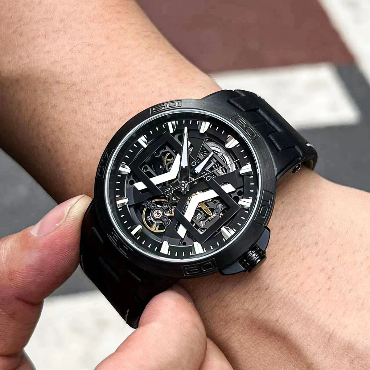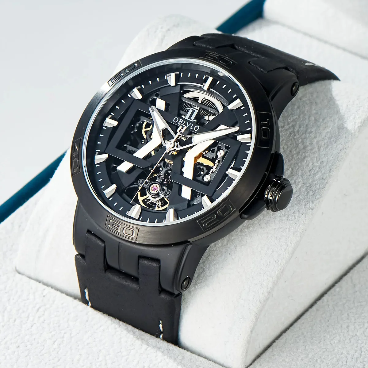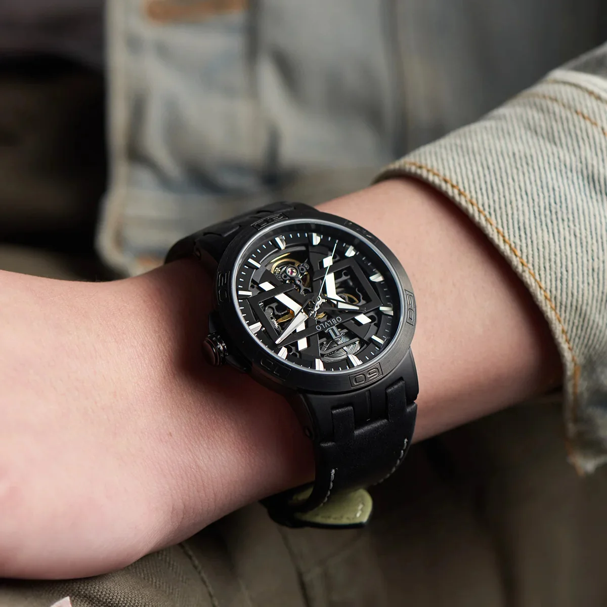 All Black Automatic Skeleton Watch with Leather Strap – Men’s Big Waterproof Watch
